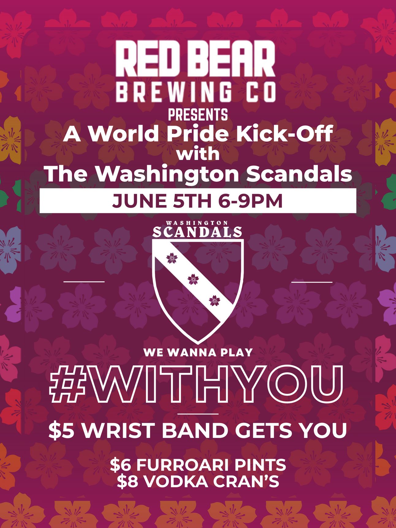 Kick off World Pride with the Washington Scandals at Red Bear Brewing Co. on June 5th 6-9pm. Wristbands are $5 and get you discounts on furroari pints and vodka crans. All proceeds from wristbands go directly to supporting the Scandals. So come on out and start World Pride with a Scandal.