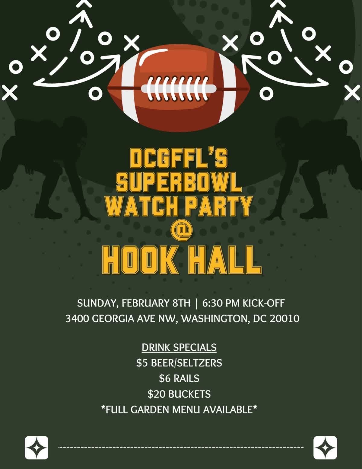 Come out to the DC Gay Flag Football League's Super Bowl watch party at Hook Hall!