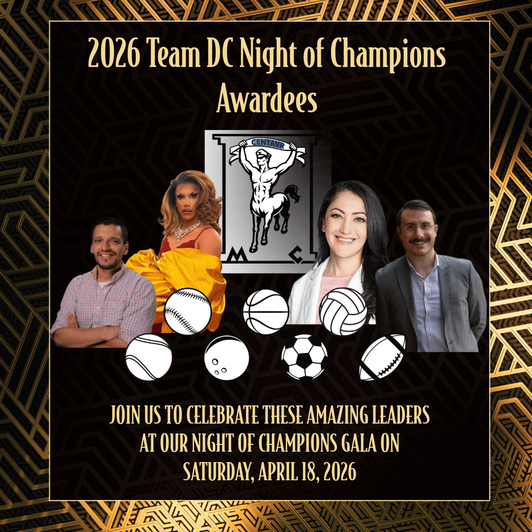 Mark your calendars! The 2026 Night of Champions Gala will take place on Saturday, April 18, 2026, at the Georgetown Marriott on 22nd Street NW. Our annual gala celebrates community leaders and the next generation of LGBTQ+ student-athletes. Join us for an inspiring evening of cocktails, dinner, and awards — all in support of Team DC’s Scholarship Program.