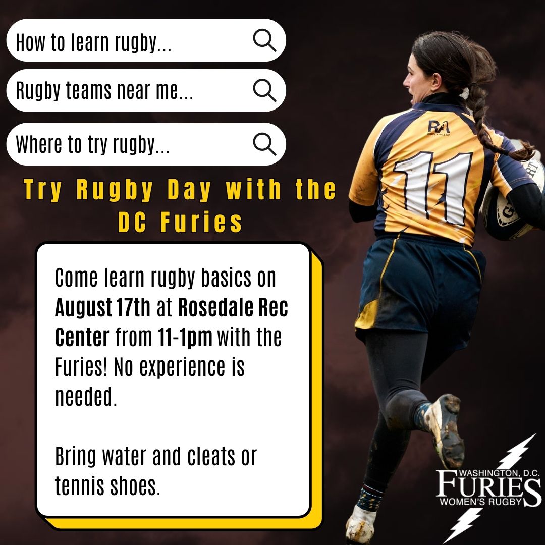 Join the DC Furies on August 17 from 11a-1pm at Rosedale Rec Center for an intro to rugby skills day!